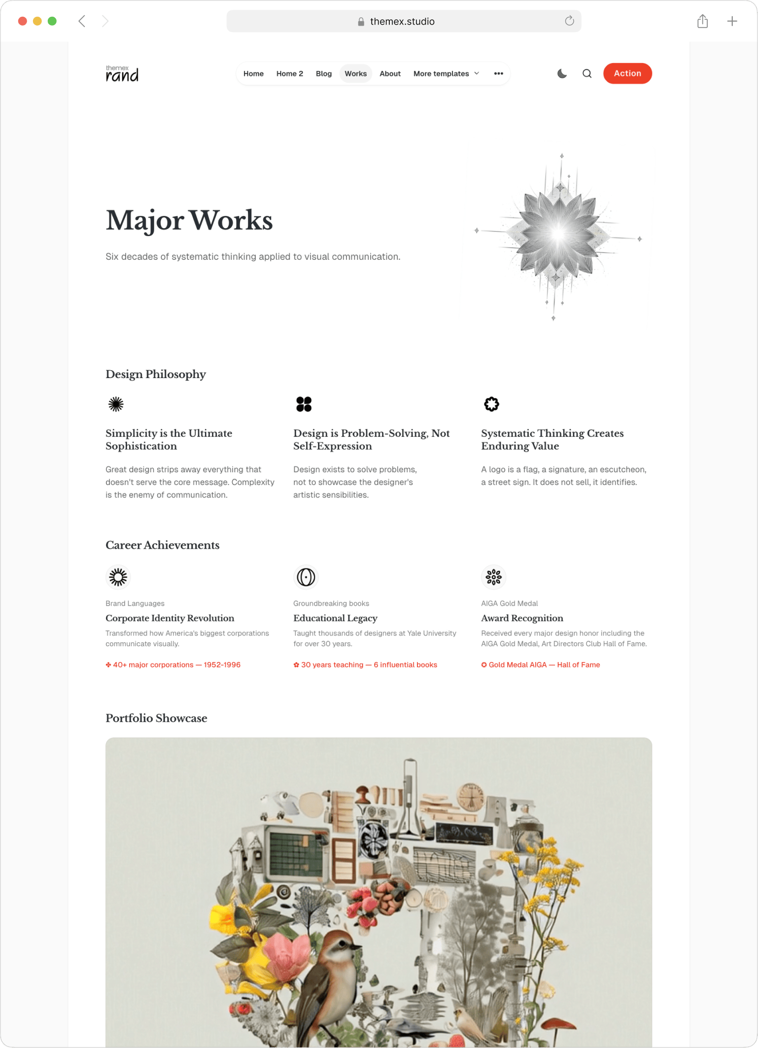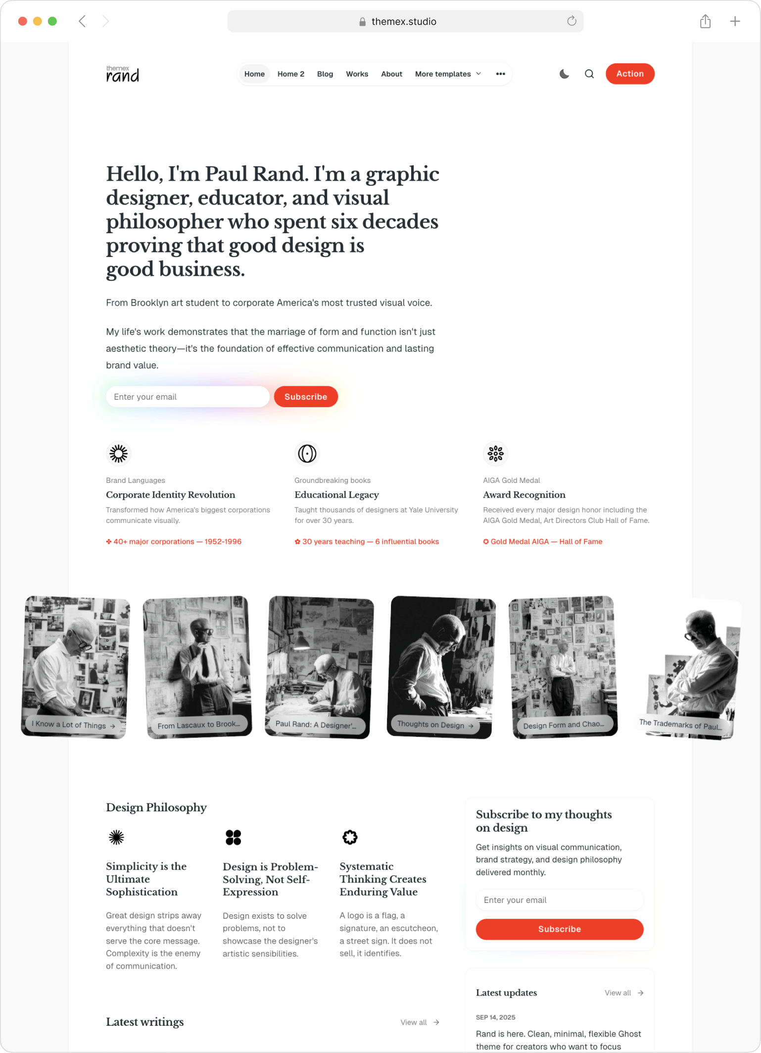 Paul Rand-inspired minimal aesthetic with customizable sections for personal branding. The flexibility to grow your brand without changing themes.