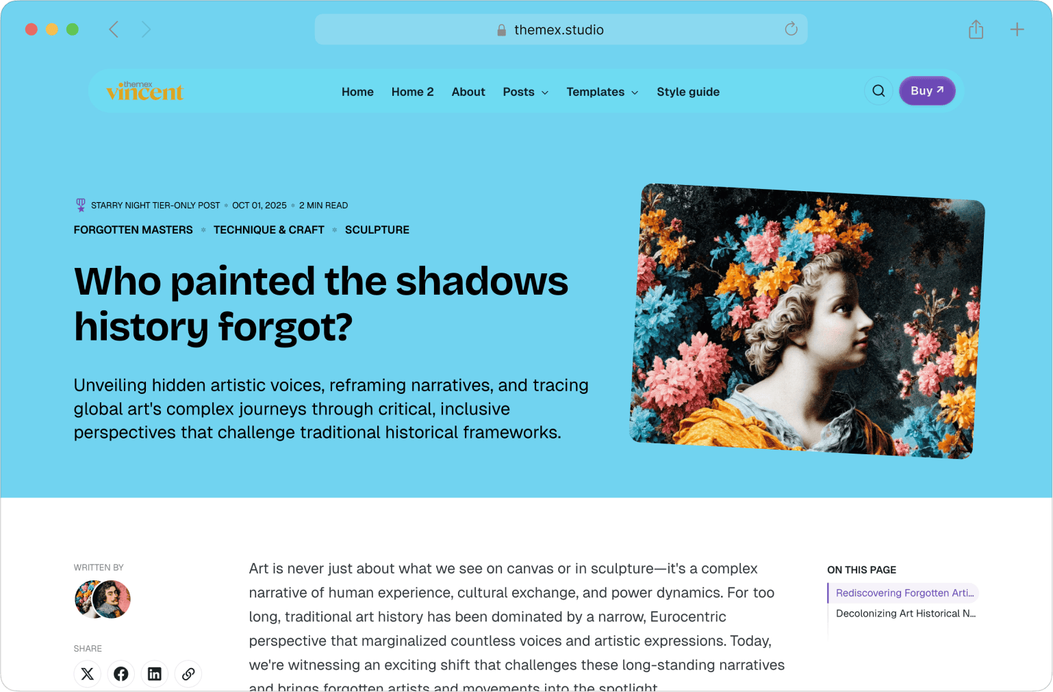 Professional editorial design for art, culture, history, technology, or lifestyle content. Strong visual hierarchy, beautiful post layouts.